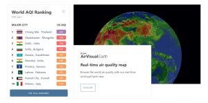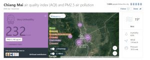 ข้อมูลจากเว็บไซต์วัดคุณภาพอากาศจากทั่วโลก www.airvisual.com พบว่าจากการเปรียบเทียบดัชนีคุณภาพอากาศ หรือ US AQI จากหัวเมืองต่างๆ พบว่ามลพิษในอากาศจังหวัดเชียงใหม่ เมื่อเวลา 07.05 น. สูงเป็นอันดับ 1 ของโลก ดัชนีคุณภาพอากาศวัดได้ 232 US AQI ปรากฎแถบสีม่วง อยู่ในระดับอันตรายต่อสุขภาพ